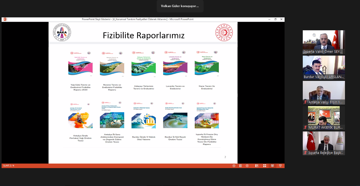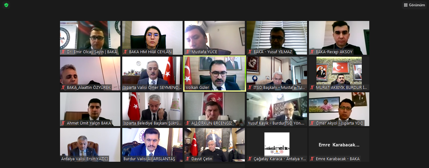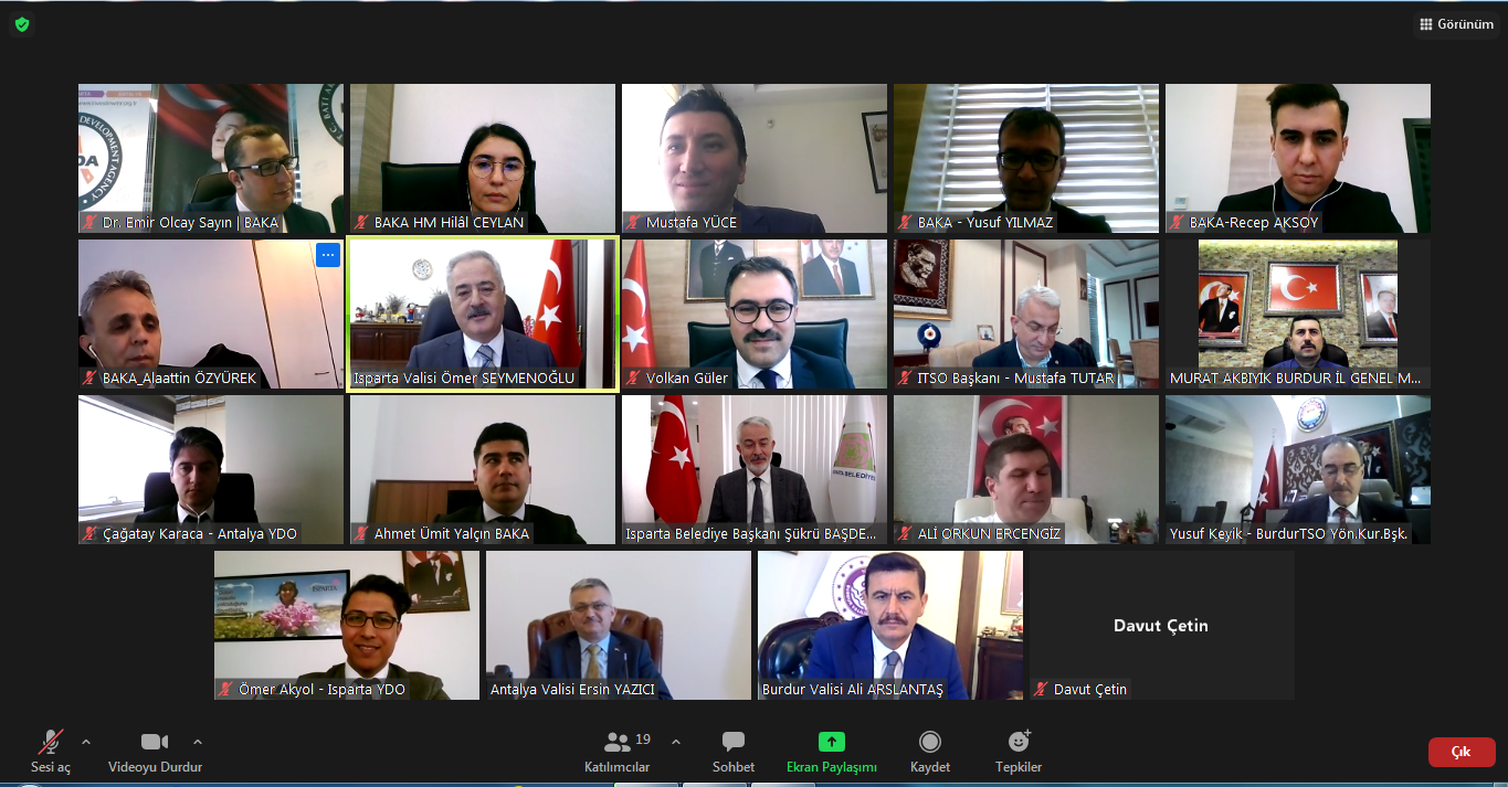 Batı Akdeniz Kalkınma Ajansı Kasım ayı olağan Yönetim Kurulu toplantısı, Isparta Valisi Ömer Seymenoğlu başkanlığında video konferans yöntemiyle gerçekleştirildi. Toplantıya Antalya Valisi Ersin Yazıcı, Burdur Valisi Ali Arslantaş, Isparta Belediye Başkanı Şükrü Başdeğirmen, Burdur Belediye Başkanı Ali Orkun Ercengiz, Burdur İl Genel Meclisi Başkanı Murat Akbıyık, Antalya Ticaret ve Sanayi Odası (TSO) Başkanı Davut Çetin, Burdur TSO Başkanı Yusuf Keyik, Isparta TSO Başkanı Mustafa Tutar, BAKA Genel Sekreteri Volkan Güler ve BAKA uzmanları katılım sağladı.