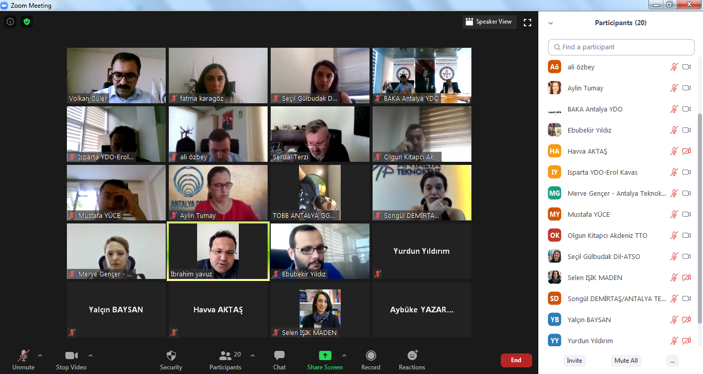 Bölgemizde girişimciliğin önünde bulunan engellerin tespit edilmesi, mevcut ihtiyaçların karşılanması ve girişimciliğin geliştirilmesi sürecindeki paydaş rollerinin belirlenmesi, gerçekleştirilecek faaliyetlerin etkilerinin Bölge geneline yayılması ve paydaşlar arasındaki ilişkilerin kuvvetlendirilmesi amacıyla Batı Akdeniz Girişimcilik Ekosistemi Platformu’nun ikinci toplantısı 24.08.2020 tarihinde COVID-19 tedbirleri kapsamında çevrimiçi konferans yöntemiyle gerçekleştirildi.