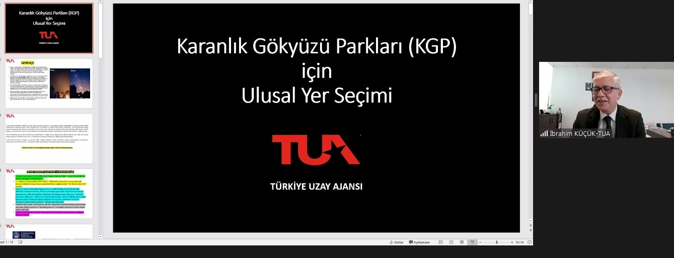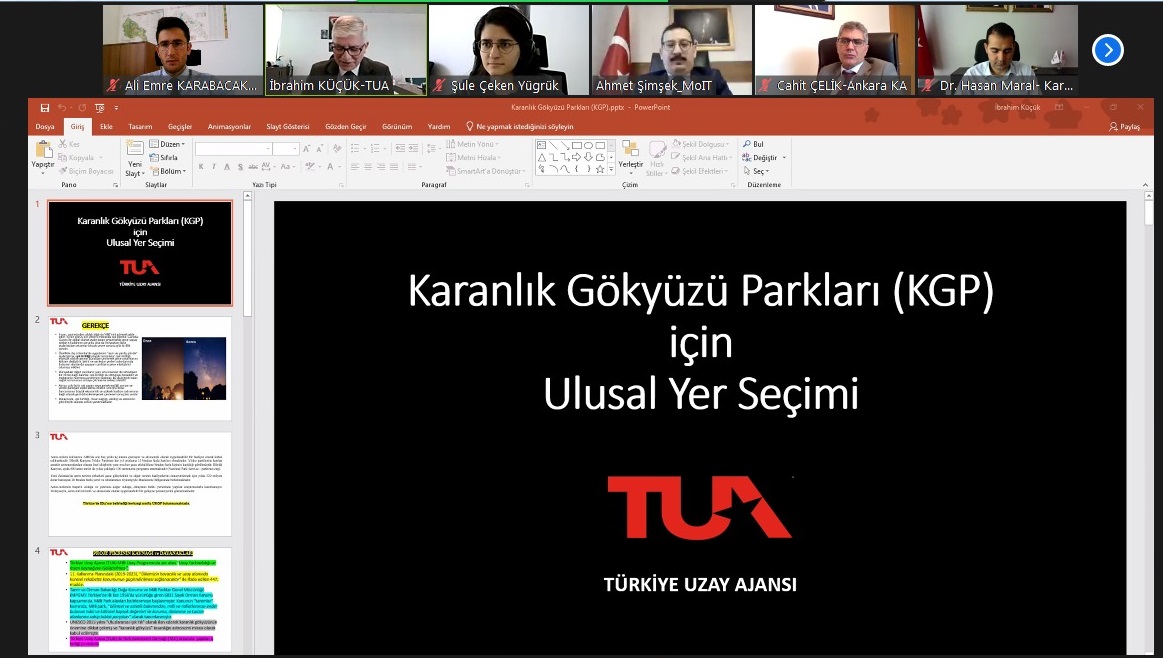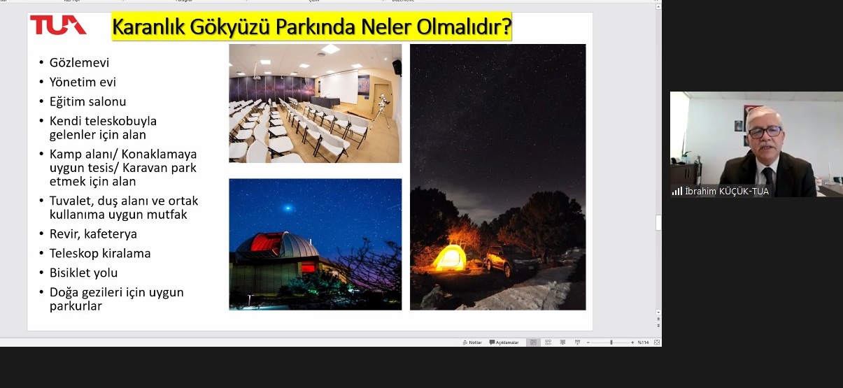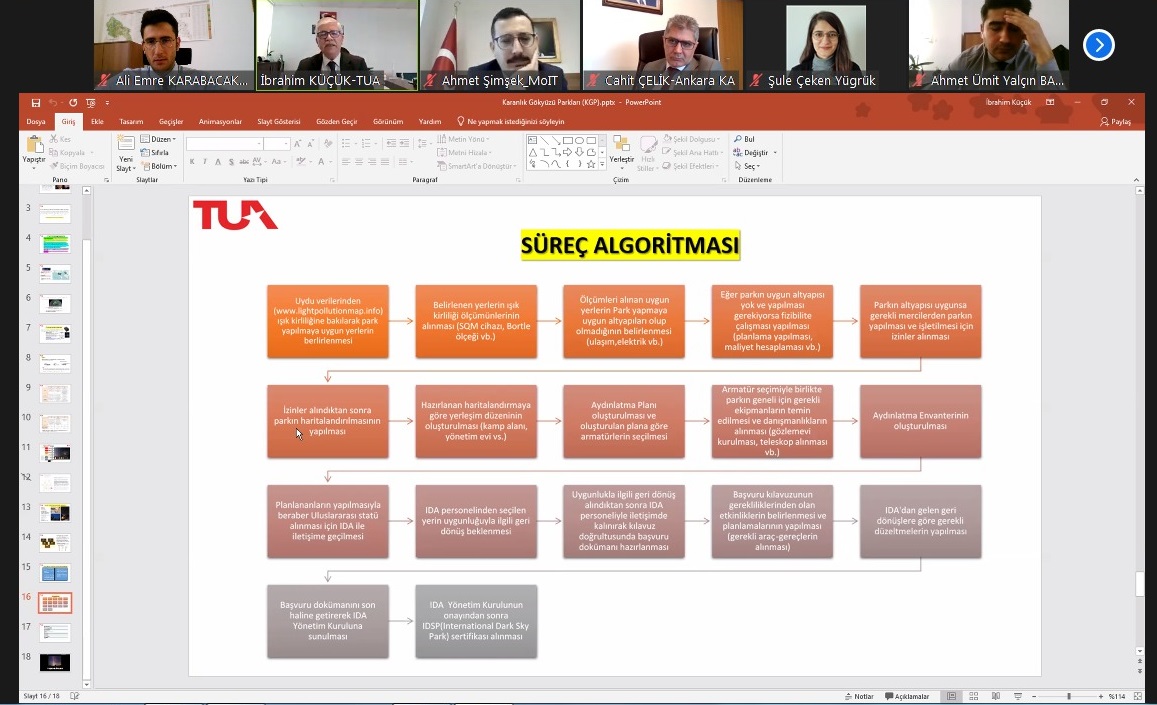 Karanlık gökyüzü parkları için ulusal yer seçimi toplantısında astro-turizm kavramı, karanlık parkların ilanına yönelik uygulama örnekleri, Türkiye'nin ışık kirliliği durumu ve ışık kirliliğini azaltmak için alınması gereken önlemler değerlendirildi. Bu kapsamda on yedi aşamadan oluşan süreç algoritması katılımcılarla paylaşıldı. Uydu verilerinin değerlendirilmesi ile başlayacak olan sürecin, aydınlatma envanterinin çıkarılması, haritalandırma gibi aşamalardan geçerek IDA International Dark Sky Park (IDSP) sertifikasının alınması ile son bulacağı ifade edildi.