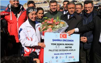 Burdur Valisi ve BAKA Yönetim Kurulu Başkan Vekili Hasan ŞILDAK, Salda Gölü’nde 1 dakika 58 saniyede 65 metreye dalarak bu alandaki dünya rekorunu kırmayı başaran Milli Sporcu Şahika ERCÜMEN ile ekip üyelerini tebrik etti. Burdur Valisi Hasan ŞILDAK, “Valiliğimiz ve Batı Akdeniz Kalkınma Ajansı'nın destekleriyle Türkiye'nin en temiz tatlı sularından biri olan Salda Gölü'nde 65 metre derinliğe ulaşıp Dünya rekorunu kırarak ülkemize uluslararası bir başarı kazandıran Milli Sporcumuz Şahika Ercümen ve bütün ekibini kutluyorum. Bugün Burdur olarak çok büyük bir mutluluğu ve heyecanı birlikte yaşadık. Milli Sporcumuz, serbest dalışta ve kadınlar segmentin de ilk defa bir tatlı suda rekor denemesi gerçekleştirdi. Dünya rekorunu elde ederek ülkemize çok güzel bir armağan sunmuş oldu. Biz kendisini Salda’da, Burdur'da ağırlamaktan büyük gurur ve heyecan duyduk. Kendisine ve ekibine teşekkür ediyorum. Hem Salda Gölü gibi yeni yeni turizme kazandırmaya çalıştığımız gölümüzün tanıtımına verdiği katkı, hem de göllerimizin özellikle Salda’nın temiz kalması, bakımlı ve korunarak turizme kazandırılması adına verdiği mesajlar bizler için çok önemlidir. Bu sorumluluk duygusu ile ülkemize kazandırdığı büyük rekorun heyecanını birlikte yaşadık. Kendisine tekrar teşekkür ediyor, tebrik ediyorum” dedi.